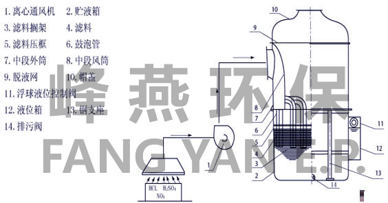 酸雾废气由引风机吸入预处理净化塔,经高速喷淋,填料处理后,再迫使气体由鼓泡管进入储液箱的吸收液中产生鼓泡,然后再经过筛板层,减速进入内筒处理器经过二级喷淋、填料处理后,再由渐扩段进入。上部慢速喷淋、填料功能段处理。这样使酸雾废气经过多功能段,多级处理逐步地使酸雾废气得雾器脱液除雾后由引风机压入主处理塔经高速喷淋,填料处理后让废气与中和液彻底反应,净化处理后尾气通过排风管进入大气。